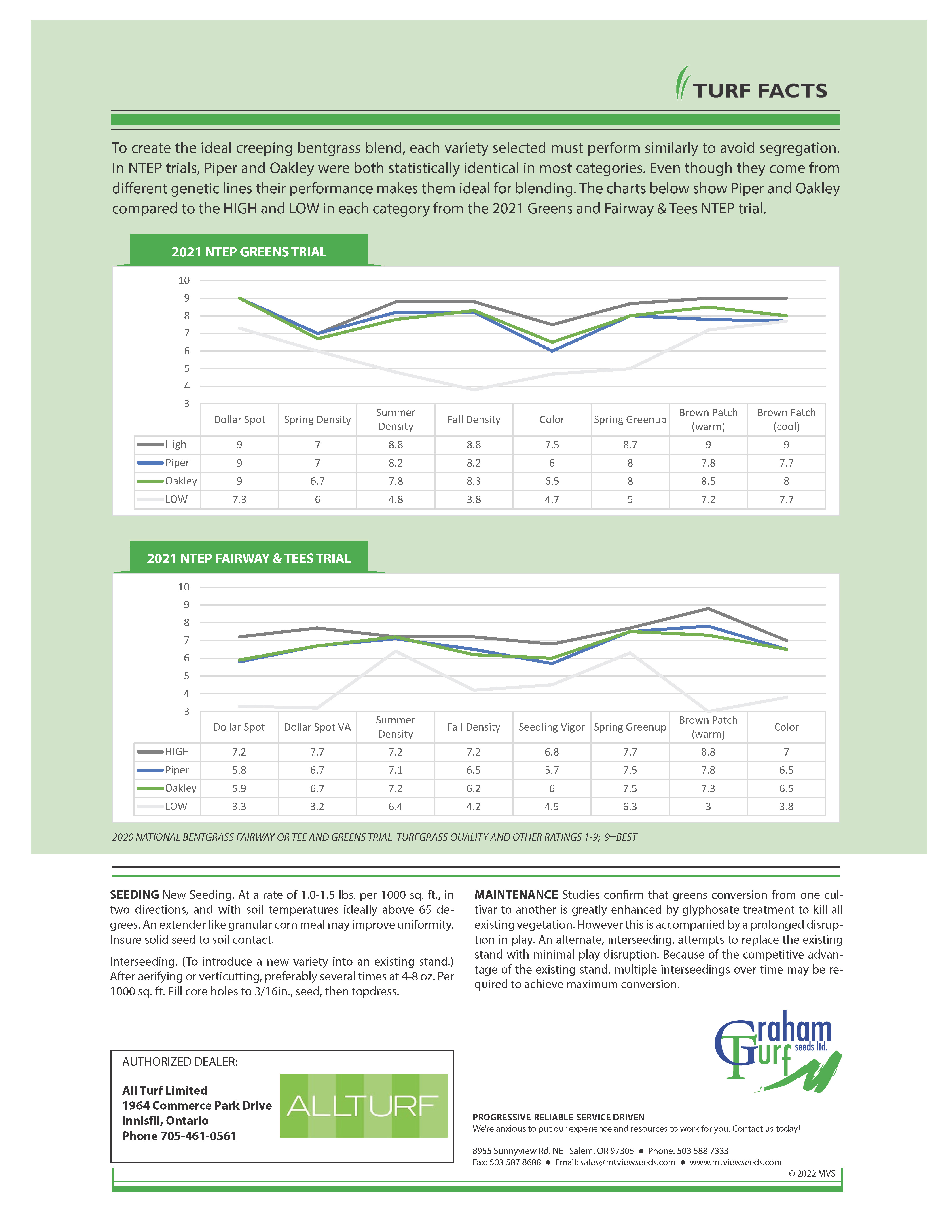Centennial bent grass blend offers the ideal solution for your golf and fine turf applications. As a blend, Centennial offers the benefits of genetic biodiversity; providing the best opportunity for success and a safety net against disease and pest issues that can destroy mono stands. But how do you create a blend that doesn’t require two different management practices? It takes a special pair of varieties to create a functional blend; they must be indistinguishable, yet genetically unique. The varieties must be identical in critical traits such as establishment, color, density, leaf texture, disease resistance and overall turf quality to ensure both thrive. Combining two similar varieties ensure a consistent, uniform playing surface that does not show segregation. Piper and Oakley, while genetically quite different, perform almost identically. In the recent NTEP trials, Piper and Oakley performed statistically the same in these critical traits. But being selected from different parents ensures they are stronger together.